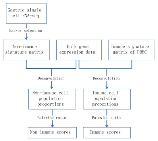 The deconvolution method was combined with the signature matrices of non-immune and immune cell populations, respectively, to estimate non-immune and immune cell relative fractions of GC samples. CIBERSORT and CIBERSORTx were run with non-negativity and sum-to-1 constraints. Thus, they estimated relative but not absolute fractions of cell populations within a sample, and the values may not be comparable across samples. We therefore defined non-immune scores (or immune scores) by calculating the ratios of relative fractions in each pair of non-immune (or immune) cell populations. The non-immune or immune scores are therefore comparable across samples (Figure 3).