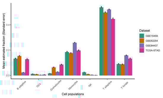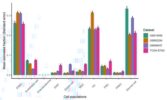 Epithelial, stromal, and immune cell populations comprise the vast majority of gastric tumor cellularity. In order to accurately dissect epithelium-stroma-immune signals from GC samples, we applied CIBERSORT [27] or CIBERSORTx [23] to RNA profiles of GC samples. Our methodology involved two separate deconvolution procedures: an immune cell deconvolution procedure and a non-immune cell deconvolution procedure, which dissect immune and non-immune signals from GC samples, respectively. The immune system is an important determinant of the TME, and we applied CIBERSORT/CIBERSORTx to infer relative immune cell subtype fractions in four cohorts of bulk GC samples by using a signature matrix derived from the peripheral blood mononuclear cell (PBMC) samples (Figure 4, see Section 2 for details). We observed that the T adaptive cell population, comprised of naive and memory CD4 and CD8 T cells, was consistently dominant across the four GC cohorts, followed by the monocyte, B adaptive, and T innate subsets. The single-cell gene expression data sets of GC offer new insights to investigating the GC TME at the resolution of single cells. To enumerate GC non-immune cell proportions, we further applied CIBERSORT/CIBERSORTx by using the single-cell reference profiles to distinguish epithelial, stromal, and endothelial cell subsets in the bulk GC samples (Figure 5, see Section 2 for details). We observed that the EMEC, PC, and stromal cell subsets were highly abundant, while the endothelial cell subset was less abundant in all four cohorts.