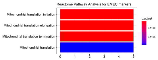 The EMEC population is composed of gastric epithelial cells (including cancer cells, MSCs, PCs, and PMCs) that were isolated from early GC patients. We analyzed the functional annotation of the EMEC gene signatures using Reactome and Gene Ontology (GO) enrichment analyses. The EMEC gene signatures were mostly enriched for mitochondrial translation, mitochondrial translational elongation, and mitochondrial translational initiation and termination in the Reactome (Figure 6) and biological process (BP) ontologies (Figure S4a); they were mainly enriched in the mitochondrial inner membrane and mitochondrial ribosome in the cellular component (CC) ontology (Figure S4b). The results suggest that the mitochondria could serve as a GC biomarker for early detection, which is consistent with previous reports showing a role for mitochondria [31,32,33] in the early detection of solid tumors.