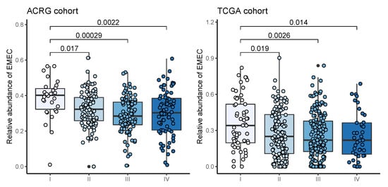 Comparison of the relative abundance of EMEC population across four stages in the ACRG and TCGA cohorts.