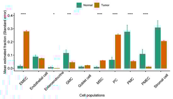We hypothesized that the EMEC population would be more abundant in patients with stage I cancer than other stages. To test this hypothesis, we estimated proportions of the EMEC population in each sample of both the ACRG and TCGA-STAD cohorts. We observed significantly higher EMEC populations in patients with stage I cancer than stage II, III, or IV in both the ACRG and TCGA-STAD cohorts (, Student’s t-test; Figure 7). To investigate whether the EMEC population was typically found in tumor samples but not in normal samples, we estimated proportions of 10 non-immune cell populations in samples from both tumor and adjacent normal tissues available in the TCGA-STAD sample collection. We observed that the EMEC population was significantly higher in tumor samples than in adjacent normal samples (, Student’s t-test; Figure 8).