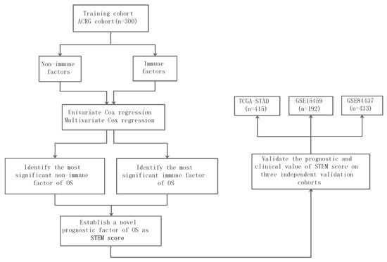 We collected four GC gene expression datasets with the associated clinical, pathological, and outcome data: GSE62254 (ACRG), GSE15459, GSE84437, and TCGA-STAD (stomach adenocarcinoma) (Table S1). The ACRG and GSE15459 data sets contained gene expression profiles of 300 and 192 patients, respectively. The raw data (CEL files) of these two data sets were downloaded from the Gene Expression Omnibus (GEO, www.ncbi.nlm.nih.gov/geo/, accessed on 1 September 2021). The CEL files were MAS5-normalized in the R environment using the affy software package. Both data sets were converted to gene-specific expression matrices using the R package hgu133plus2.db. For the GSE84437 data set, we directly downloaded its expression matrix after using quantile normalization from GEO. The R package illuminaHumanv3.db was used to translate probe identifications (IDs) to gene symbols. When multiple probes were present for one gene, we selected the probe with the highest average expression across the samples. The TCGA-STAD data set from The Cancer Genome Atlas (TCGA) was downloaded by using the getTCGA function of R package TCGA2STAT. RNA-Seq version 2 data were processed using RSEM algorithm [24], which generated estimated counts as a proxy for RNA expression levels.