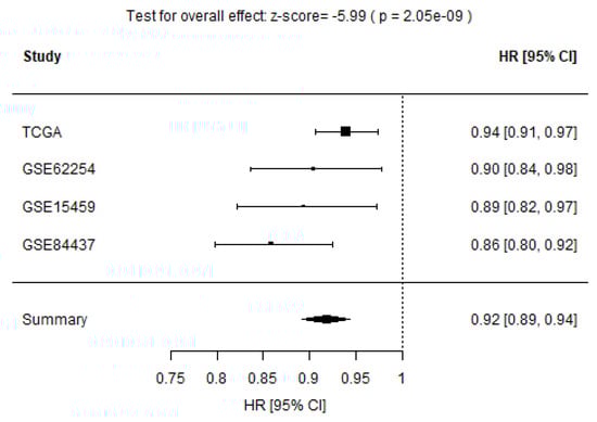 To validate whether the STEM score had consistent prognostic value in different cohorts, we applied it to three independent validation data sets from TCGA-STAD, GSE15459, and GSE84437. The multivariate Cox proportional hazard analyses, which account for age, sex, stage, Lauren histology, and adjuvant chemotherapy/radiation therapy treatment (if applicable as additional clinical covariates) confirmed that the STEM score was an independent prognostic factor of OS in each validation data set (TCGA-STAD: HR 0.94, , GSE15459: HR 0.89, , and GSE84437: HR 0.86, ; Table 4). We further performed a meta-analysis to evaluate the overall effect of the STEM score on clinicopathologic factor-adjusted survival. We added three validation cohorts to the training cohort. A forest plot of estimated hazard ratios indicated the STEM score was a significant independent prognostic factor of OS (HR = 0.92, , z-test for overall effect; Figure 10).