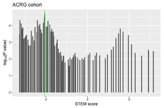 We next assessed the predictive value of the STEM score for risk stratification. For the ACRG cohort, we stratified 300 patients into two groups (low vs. high) according to the STEM score and using an optimal cutoff of 3.95 (Figure 11; see Section 2 for details). The Kaplan–Meier curve showed that patients in the high-STEM score group had significantly longer OS times than patients in the low-STEM score group (, log-rank test; Figure 12).