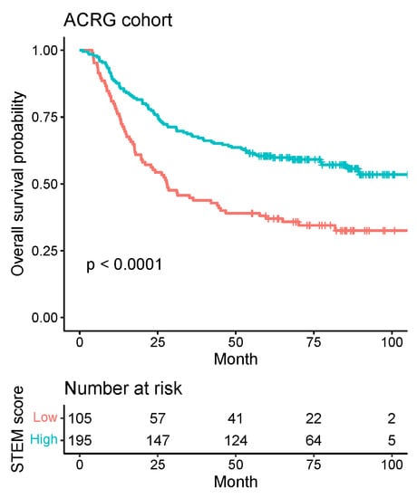 Kaplan–Meier survival curves for the patients with low vs. high STEM scores in the ACRG cohort.