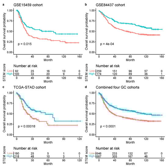 Kaplan–Meier plots for the OS of patients with low vs. high STEM scores in the GSE15459 (a), GSE84437 (b), TCGA-STAD (c) cohorts and a combined set of four cohorts (ACRG, GSE15459, GSE84437, and TCGA-STAD) (d). Significance test p value is shown in the lower left.