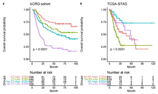 (a) Kaplan–Meier survival curves for the four groups (including chemotherapy-high STEM score, chemotherapy-low STEM score, no chemotherapy-high STEM score, and no chemotherapy-low STEM score) in the ACRG cohort. Significance test p value is shown in the lower left. (b) Kaplan–Meier survival curves for the four groups (including radiation therapy-high STEM score, radiation therapy-low STEM score, no radiation therapy-high STEM score, and no radiation therapy-low STEM score) in the TCGA-STAD cohort.