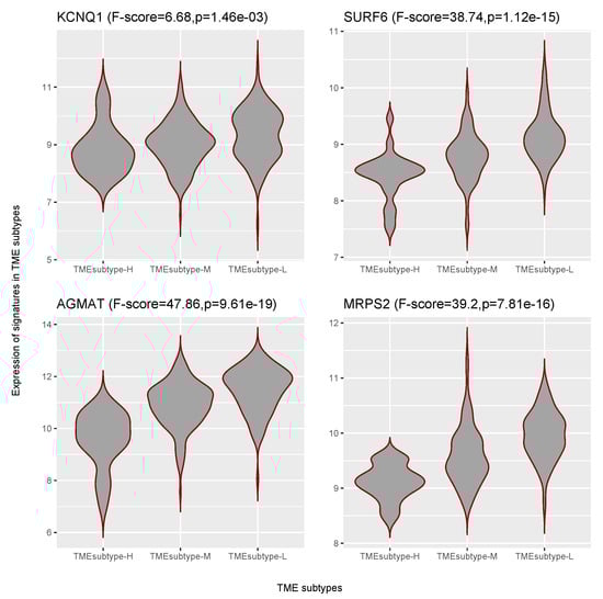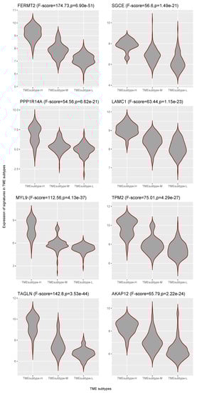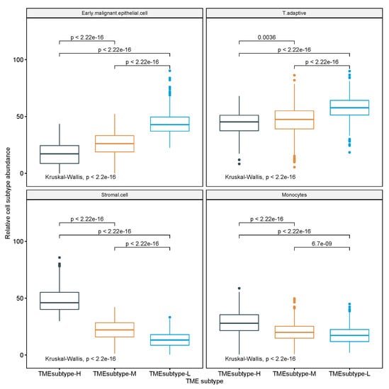 By using multivariate Cox regression analysis and univariate Kaplan–Meier analysis in Section 3.3, four prognostic cell populations of Stromal cell, adaptive T cell, EMEC, and monocytes, referred to as STEM populations, that had been found to be significant in the univariate Cox regression analyses were further examined to be prognosis stratification factors in gastric cancer. Thus, these four cell populations were selected to perform cluster analysis of all 1340 GC samples in four GC cohorts. Based on the estimated relative abundance of these four cell populations, we applied spectral clustering with the optimal number of clusters chosen by NbClust (see Section 2 for details). The three resulting TME subtypes, including TMEsubtype-H, TMEsubtype-M, and TMEsubtype-L (with 302, 591, and 447 samples, respectively) were characterized by a distinct distribution of relative abundance over the four selected cell populations. The relative abundance of these four cell populations varied significantly across the three TME subtypes (, Kruskal–Wallis test; Figure 15). The TMEsubtype-H cluster had the highest stromal cell (mean proportion = 0.48, , Wilcoxon test relative to the next-highest; Figure 15, left bottom) and monocyte abundance (mean proportion = 0.29, , Wilcoxon test relative to the next-highest; Figure 15, right bottom), while it had the lowest EMEC (mean proportion = 0.17, , Wilcoxon test relative to the next-lowest; Figure 15, left top) and adaptive T cell abundance (mean proportion = 0.44, , Wilcoxon test relative to the next-lowest; Figure 15, right top). However, in the TMEsubtype-L, the opposite was observed. The TMEsubtype-L cluster was found to have the lowest stromal cell (mean proportion = 0.14, , Wilcoxon test relative to the next-lowest; Figure 15, left bottom) and monocyte abundance (mean proportion = 0.18, , Wilcoxon test relative to the next-lowest; Figure 15, right bottom), while it had the highest EMEC (mean proportion = 0.44, , Wilcoxon test relative to the next-highest; Figure 15, left top) and adaptive T cell abundance (mean proportion = 0.57, , Wilcoxon test relative to the next-highest; Figure 15, right top). The mean proportions of EMEC, stromal cell, adaptive T cell, and monocytes for the TMEsubtype-M were 0.25, 0.22, 0.47, and 0.2, respectively.