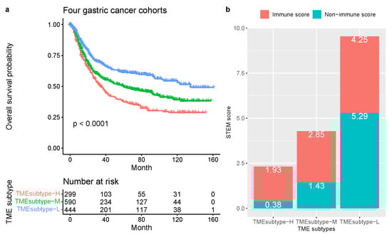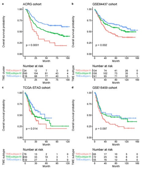 We further examined the TME subtypes’ association with OS. The TMEsubtype-L had the best prognosis (OS HR ( CI) 0.52 (0.42–0.65), relative to the TMEsubtype-H, adjusted for age and sex); the TMEsubtype-M had intermediate prognosis (OS HR ( CI) 0.76 (0.63–0.91), relative to the TMEsubtype-H, adjusted for age and sex); and the TMEsubtype-H had the least favorable outcome (, log-rank test; Figure 16a). A decreased value of the STEM, non-immune, or immune score led to worse outcomes in the TMEsubtype-H (Figure 16b). The survival analysis revealed a substantial difference in OS among the three TME subtypes. Robust correlations between the identified TME subtypes and OS were also validated in ACRG (, log-rank test; Figure 17a), GSE84437 (, log-rank test; Figure 17b), and TCGA-STAD (, log-rank test; Figure 17c) cohorts, separately. Patients in different GC cohorts were stratified into three groups with significantly distinct prognoses, and it was found that the lower the STEM score the poorer the patient survival outcome. Although the difference in the GSE15459 cohort was not statistically significant (, log-rank test; Figure 17d), the TMEsubtyp-H still had the poorest outcome.