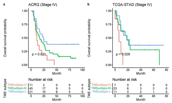 TME subtype in patients with stage IV GC. Kaplan–Meier plots for the OS of patients with stage IV GC stratified into three TME subtypes in the ACRG (a) and TCGA-STAD (b) cohorts.
