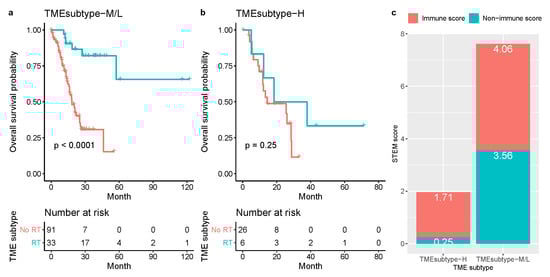 Relationship between the TME subtypes and survival benefit from radiation therapy in matched patients with stage III gastric cancer: (a) TMEsubtype-H, (b) TMEsubtype-M/L. (c) Compare the mean non-immune and immune scores of patients in the TMEsubtype-H to the TMEsubtype-M and -L for stage III disease in the TCGA-STAD cohort.