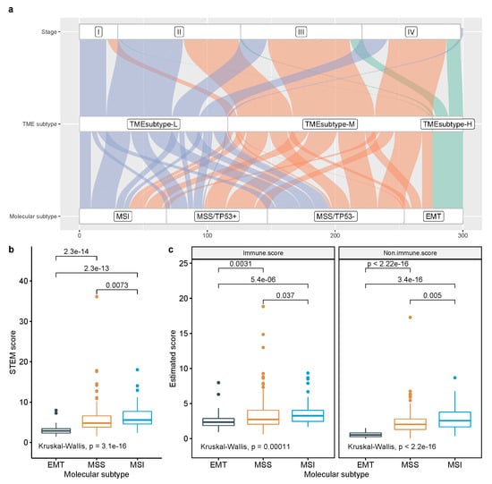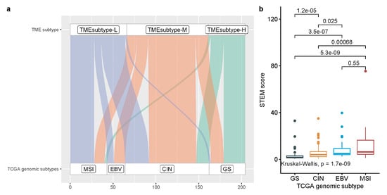 To investigate the predictive value of the TME subtypes for radiation therapy response in the TCGA-STAD cohort, we evaluated the association between TME subtypes and overall survival among stage III patients who either received or did not receive radiation therapy. We found that for patients in the TMEsubtype-M and TMEsubtype-L group, radiation therapy was associated with improved OS (HR 0.16, 95% CI (0.06–0.4), ; Figure 19a). However, for patients in the TMEsubtype-H group, performing radiation therapy did not improve OS (HR 0.49, 95% CI (0.14–1.72), ; Figure 19b). The mean STEM score of patients in the TMEsubtype-H group was substantially smaller than those in the TMEsubtype-M and TMEsubtype-L groups (Figure 19c).
