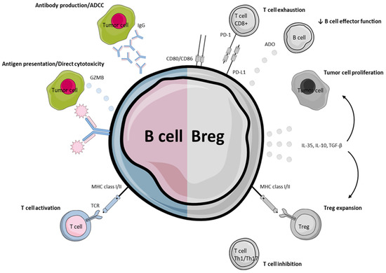 Furthermore, findings on the function and protein expression of certain Breg phenotypes have illustrated them as eligible targets for ICB therapy. In hepatocellular carcinoma, a distinct phenotype of CD5(hi)CD24(−/+)CD27(hi/+)CD38(dim) Bregs displaying high levels of PD-1 expression has been observed to exert pro-tumorigenic effects and T-cell suppression through IL-10 production after activation of the PD-1/L1 pathway [101]. Moreover, in a study on systemic lupus erythematosus CD19+CD24hiCD38hi Bregs have been shown to impede Th1 differentiation following IL-10 production, an effect that was overcome by the addition of CD80 and CD86 mAbs, which are known ligands for the CTLA-4 immunoregulatory molecule [107]. The same phenotype was investigated by Wang et al. in gastric carcinoma, where it was found to promote immunosuppression by the reduction of IFN-γ and TNF-α secretion by CD4+Th cells and was associated with CD4+FoxP3+ Treg density [108]. An additional study on EMT-6 mammary tumor implanted in mice revealed that B-cells acquire a regulatory phenotype (LAP/TGF-β1, CD80, CD86, PD-L1) after cell-to-cell interaction with cancer cells and their immunosuppressive dynamic can be counteracted by mAbs against TGF-β and PD-L1, leading to tumor shrinkage [102]. In metastatic melanoma, PD-L1+-circulating B-cells were associated with the advanced disease stage and have increased presence in metastatic rather than primary sites. This subpopulation presented a naïve-like phenotype (CD20+CD27-), high IgM and IgD production compared with total B-cells and most importantly, suppressed T-cell activity through PD-L1 expression [103]. A similar Breg phenotype (PD-1-PD-L1+CD19+) has been described to be acquired by B-cells under the influence of MDSCs in breast cancer TME [109]. Bregs have also been investigated as potential therapeutic targets for various other agents in preclinical studies, with the aim of overcoming their immunoinhibitory effects and reinstating efficient anti-tumor immunity. The use of resveratrol in a 4T1 metastatic breast cancer murine model achieved shrinkage of lung metastasis, a result that was attributed to Breg inhibition, and consequently, TGF-β downregulation, through inactivation of Stat3 [110]. Similarly, in the same tumor type, inactivation of 5-lipoxygenase/leukotriene/PPARa pathway by MK886 Breg inhibitor resulted in a significant reduction of tumor growth and elimination of its metastatic potential [111]. The most important effector B-cell and Breg functions in the TME are illustrated in Figure 1.