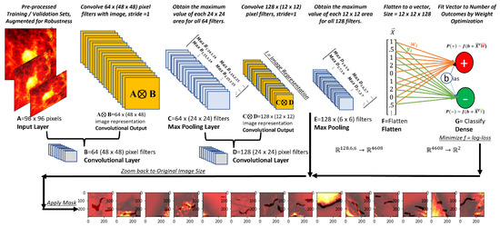 Assume that we are evaluating pre-processed images of 96 × 96 pixels with 1 color channel (‘A’ in Figure 1). Many image filters of smaller size (e.g., 48 × 48 pixels, ‘B’ in Figure 1) are passed over the original image, section by section, one or more pixels at a time. The tensor product, A⦻B, is taken for each of these regions (convolutional output). Moving each of our 48 × 48 filters over the original 96 × 96 images 1 pixel at a time generates a new 48 × 48 matrix. The convolutional layer output, a set of smaller image representations, are additionally processed through a function for classification improvement (a rectifier function that adds additional nonlinearity to images, f (x) = max (0, x). Smaller filters (24 × 24 pixels in Figure 1, ‘C’) are applied to convolutional layers. These filters execute ‘maximum pooling’ (keeping the maximum value in each region) or ‘average pooling’ (averaging all values). Multiple layers (‘D’ and ‘E’ in Figure 1) are then combined in a network structure. The final image representation is flattened into a single vector (dense layer, ‘F’ in Figure 1). The inner product of this vector and weights (tuned through nonlinear optimization) are added to a constant (bias) and processed through a ‘softmax’ function (‘G’ in Figure 1). The softmax function provides the probability of negative (−) or non-negative (+) imagery Equation (1).