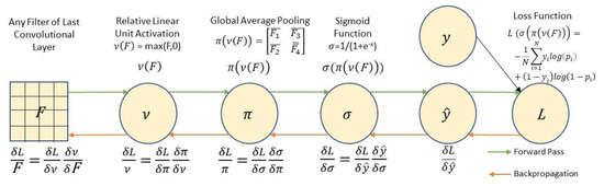 Figure 2 represents the last functions of the ConvNet provided the probability prediction for the image. For each filter F in the last convolutional layer, we seek the gradient of the loss function with respect to the image, . The forward pass (green arrows) results in a composite function from the filters through the rectifier, global average pooling, the sigmoid function to the forecast. To calculate requires that we ‘backpropagate’ the gradients (red arrows) using the chain rule until we are able to estimate our loss gradient with respect to the filter. These calculations are supported by TensorFlow and need not be done manually [38].