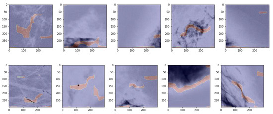 We used TensorFlow’s ‘GradientTape’ function to calculate the gradient of the loss function at the last convolutional layer’s reconstructed image, which includes 512 filters of size 18 × 18 pixels. After producing the gradient map, we zoomed the image back to 299 × 299 to produce contour overlays for the images. To further identify areas of concern, we filtered for the top 10% of the image values. In Figure 4, we show the first 10 positive images in the data set in gray scale with the contour mask of the gradient superimposed (showing as pink).