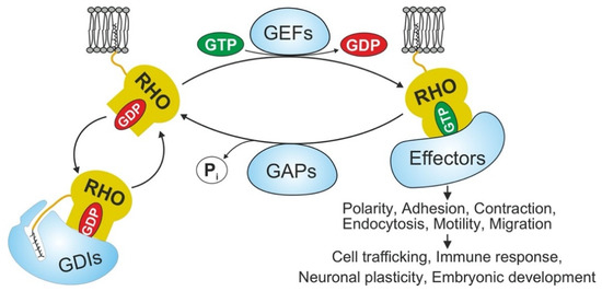 RHO family proteins are GDP/GTP-binding proteins of the RAS superfamily that transduce extracellular signals into intracellular responses. They cycle, with some exceptions, between an inactive GDP-bound (“off”) state and an active GTP-bound (“on”) state (Figure 1) [1,2]. Fully processed GTPases remain locked in an inactive GDP-bound form in the cytosol via the formation of stoichiometric complexes with RHO GDP dissociation inhibitors (GDIs) [3]. During the signal transduction to its downstream effectors to activate multiple signaling pathways, most RHO GTPases acquire their active state with the exchange of GDP for GTP as a consequence of two continuous steps. The first step involves their release from GDI complexes, followed by rapid GDP/GTP exchange, a process catalyzed by RHO-specific guanine nucleotide exchange factors (GEFs) [1,2,4,5,6]. In the active state, conformational changes of two flexible regions, called switch I and switch II, provide a functional platform for the interaction of RHO GTPases with their regulators and effectors [7,8]. At the end of the GTPase cycle, hydrolysis of the bound GTP is stimulated by GTPase-activating proteins (GAPs) and converts RHO GTPases to the GDP-bound inactive state [2,9,10]. RhoGDI can extract both inactive and active RhoGTPases, and found that extraction of active RhoGTPase contributes to their spatial regulation around cell wounds [9].