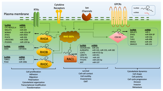 RHO GTPase-related lncRNAs. RHO GTPases are activated by RHO GEFs via different receptors, including GPCRs (G-protein coupled receptors with various ligands, such as Angiotensin II, Endothelin, LPA, S1P1, Thrombin, and Thromboxane A2), RTKs (receptor tyrosine kinases with ligands, such as EGF, Ephrins, NGF, PDGF, and VEGF), ion channels (with ligands, including nicotinic acetylcholine or glutamate), and cytokine receptors (with ligands, including Interferons, Interleukins, and Tumor necrosis factors). Members of the RHO GTPase family, such as RHOA, RHOB, RHOC, RAC1, and CDC42, are modulated by lncRNAs, which are the key regulators of gene expression. They play essential roles in a wide variety of signaling pathways, and thus processes involved in tumor progression. lncRNAs act as ceRNAs by sponging tumor suppressor miRNAs, thereby indirectly regulating the expression of genes related to RHO GTPases.