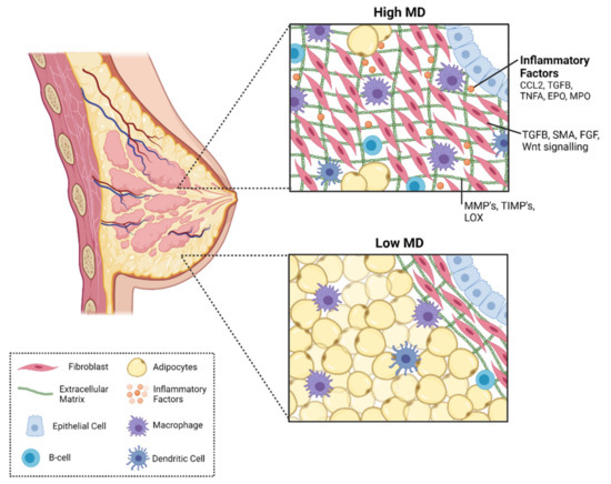 In the mammary gland, collagen is regulated by other proteins in the stroma produced by surrounding fibroblasts and immune cells [73]. Matrix metalloproteinases (MMPs) break down components of the ECM including collagen and the basement membrane, and this action is inhibited by tissue inhibitors of metalloproteinases (TIMPs) [102,103]. One study has investigated these enzymes in mammographic density; however, the associations were inconsistent and appeared to be dependent on ethnicity [104]. In breast cancer, MMPs are secreted by the tumour, surrounding fibroblasts, and infiltrating immune cells to remodel the ECM, promoting tumorigenesis, invasion, angiogenesis and metastasis [105,106].