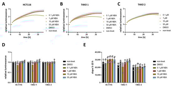 Viability of HCT116 and T4KO cell lines after treatment with NBA. Cell viability in HCT116, T4KO 1, and T4KO 2 cells was evaluated using a RealTime-Glo MT assay. Cells were treated with 0.1 µM, 1 µM, 10 µM, 50 µM NBA, or DMSO control. Four independent experiments were performed. (A) Mean of relative luminescence was plotted versus time for HCT116 cells. (B) Same for T4KO 1 cells. (C) Same for T4KO 2 cells. (D) Scatter plot and bar diagram of data (mean + SD) at 24 h from four independent experiments in (A–C). (E) Scatter plot and bar diagram of slope steepness between 5 and 10 h (mean + SD) from data in (A–C). One-way ANOVA was used to determine statistical significance in (D,E).