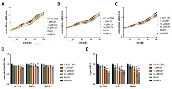 Effect of CBA on HCT116 cells’ proliferation. Cell proliferation was determined with an xCELLigence® system. Cells were treated with 0.1 µM, 1 µM, 10 µM, 50 µM CBA, or DMSO control. A total of 3–4 independent experiments were performed. (A) Mean of cell index was plotted versus time for HCT116 cells. (B) Same as (A) for T4KO 1 cells. (C) Same as (A) for T4KO 2 cells. (D) Scatter plot and bar diagram of data (mean + SD) at 24 h from the experiment in (A–C). (E) Scatter plot and bar diagram of slope steepness between 5 and 15 h (mean + SD) from data in (A–C). One-way ANOVA was used to determine statistical significance (* p < 0.05, ** p < 0.005, *** p < 0.0005, **** p < 0.0001) in (D,E).