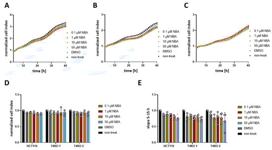 Effect of NBA on HCT116 cells’ proliferation. Cell proliferation was determined with an xCELLigence® system. Cells were treated with 0.1 µM, 1 µM, 10 µM, 50 µM NBA, or DMSO control. A total of 3–4 independent experiments were performed. (A) Mean of cell index was plotted versus time for HCT116 cells. (B) Same as (A) for T4KO 1 cells. (C) Same as (A) for T4KO 2 cells. (D) Scatter plot and bar diagram of data (mean + SD) at 24 h from the experiment in (A–C). (E) Scatter plot and bar diagram of slope steepness between 5 and 15 h (mean + SD) from data in (A–C). One-way ANOVA was used to determine statistical significance (* p < 0.05) in (D,E).