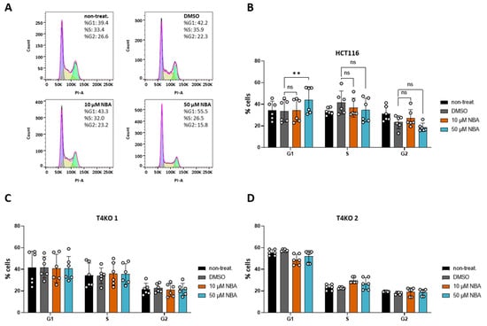 Effect of NBA on cell cycle in HCT116 and T4KO cells. FACS-based cell cycle analysis. The experiment was repeated four times with from one to two replicates in each experiment. (A) Representative histograms of PI staining in HCT116 without inhibitor treatment, treated with DMSO and treated with 10 µM and 50 µM NBA, with cell distribution in % for one specific measurement. (B) Scatter plot and bar diagram (mean + SD) for cell cycle distribution of HCT116 without inhibitor treatment, treated with DMSO and treated with 10 µM and 50 µM NBA. (C) Scatter plot and bar diagram (mean + SD) for cell cycle distribution of T4KO 1 without inhibitor treatment, treated with DMSO and treated with 10 µM and 50 µM NBA. (D) Scatter plot and bar diagram (mean + SD) for cell cycle distribution of T4KO 2 without inhibitor treatment, treated with DMSO and treated with 10 µM and 50 µM NBA. One-way ANOVA was used to determine statistical significance (** p < 0.005, ns—non significant) in (B–D).