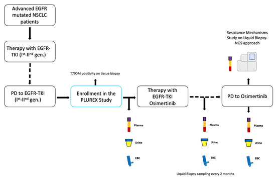 In University Hospital of Parma, we enrolled locally advanced (stage IIIB-C) or metastatic (stage IV) EGFR mutated NSCLC patients with confirmed T790M mutation on tissue, in disease progression (PD) to first-line treatment with first- or second-generation EGFR-TKIs. The PLUREX study is a real-world experience aiming firstly to evaluate the sensitivity of mutational screening for plasma, urine and EBC specimens as well as to identify the best combination of different sources of cfDNA that maximize the sensitivity in EGFR mutations detection. Moreover, as an explorative objective, we aimed to identify novel molecular abnormalities responsible for resistance to osimertinib, through a liquid biopsy NGS approach. This study obtained the ethical approval by local Ethics Committee and all patients signed specific informed consent form before any procedure. Patients who entered the study received osimertinib (80 mg/day) as a second-line therapy until disease progression or clinical benefit. We collected plasma, urine and EBC specimens from patients before the beginning of the therapy (baseline timepoint) and every two months until PD (Figure 1).