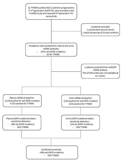 Lung cancer is the most frequent cause of cancer-related death worldwide [1]. The majority of the lung cancer diagnoses (85%) are non-small cell lung cancer (NSCLC), which comprises lung adenocarcinoma (about 60%) and lung squamous cell carcinoma (30%). In the NSCLC scenario, about 10–15% of Caucasian cases present somatic sensitizing mutations in the epidermal growth factor receptor (EGFR), for which three generations of tyrosine kinase inhibitors (TKIs) have been developed able to significantly improve patients’ survival outcomes [2]. Despite the undeniable efficacy, within 10–12 months of first- or second-generation TKI treatment, acquired resistance is achieved due to resistant mutations, that are inevitably established [3,4]. The most frequent molecular cause of resistance to first- or second-generation of EGFR TKIs is the appearance of the p.T790M and its identification is crucial to continue a target treatment with the third-generation TKI osimertinib [5,6].