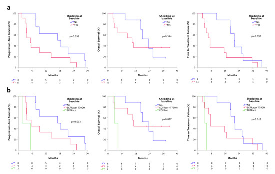 Patients with ctDNA positivity at least for the sensitizing EGFR mutation at baseline were considered “ctDNA shedder”. We found that shedder patients (11) had a shorter PFS (5.3 vs. 17.0 months, p = 0.059), TTF (7.4 vs. 21.3 months, p = 0.097) and OS (15.7 vs. 26.5, p = 0.544), compared to non-shedder population (8) (Figure 3a). Moreover, dividing shedder patients based on the “shedding type” (shedder for the only activating mutation or shedder for both activating and T790M mutation) we found a significant difference in terms of PFS, TTF, and OS. Specifically, patients who were shedder for the only activating mutation (2) had a significantly shorter PFS (1.6 vs. 5.5 months, p = 0.013), TTF (4.1 vs. 7.4 months, p = 0.012) and OS (4.1 vs. 16.7, p = 0.027), compared to patients who were complete shedders (9) at baseline (Figure 3b).