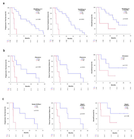 Survivals according plasmatic shedding status at T1 by ddPCR. (a) PFS, TTF and OS according to the shedding status at T1 time-point; (b) PFS, TTF and OS according to plasma clearance at T1 time-point; (c) PFS, TTF and OS according to the retained EGFR activating mutation. Shedder, patients with at least detectable activating EGFR mutations on plasma; non-shedder, patients with plasma sample negative for any EGFR mutation. Clearance, ctDNA positive patients at baseline that turned into negative at T1; Retained EGFRact, EGFRact and T790M positive patients at baseline that maintain activating mutation at T1.