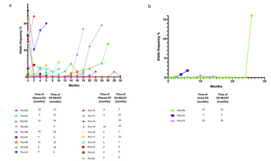 Patients had routinary radiological reassessment of disease and plasma as well as urine specimens were collected every two months until PD and evaluated in their dynamic changes in terms of ctDNA status (positivity or negativity for at least the activating EGFR mutation). Timing of plasma/urine progression, here defined as any increase in allelic frequency of the sensitizing EGFR mutation in relation with baseline levels, was compared with timing of PD according RECIST radiological criteria. In the analyzed cohort (19/20) we observed that plasma PD foreruns radiological PD with a median time of 2 months; remarkably, also in urine we observed positivity in three patients before the radiological PD, with a median lead time of 2 months similarly to plasma samples (Figure 5a,b).