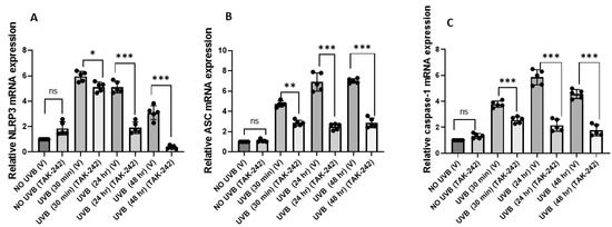 TLR4 inhibitor TAK-242 inhibits UVB-induced NLRP3, Caspase-1, and ASC activation. SKH-1 mice were exposed to a single dose of UVB radiation (100 mJ/cm2) and were thereafter sacrificed at different time points. Skin samples were obtained and analyzed for, NLRP3, caspase-1, and ASC mRNA expression. (A–C) The expression of NLRP3, Caspase-1, and ASC were significantly lower in the skin of TAK-242 treated mice. The expression level of NLRP3, Caspase-1 and ASC mRNA was normalized to the expression level of the GAPDH mRNA in each sample as described in the Methods section. Experiments were conducted and repeated separately in 5 mice in each group with identical results. (* p < 0.05, ** p < 0.01, and *** p < 0.001 and ns, not significant).