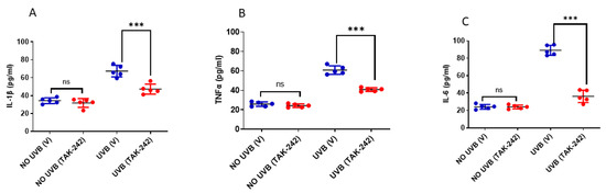 TLR4 inhibitor TAK-242 causes a decrease in expression of inflammatory cytokines. SKH-1 mice were exposed to a single dose of UVB radiation (100 mJ/cm2) and were thereafter sacrificed after 24 h to collect blood. Serum was collected from blood and concentrations of IL-1β, TNF-α and IL-6 were determined using Invitrogen (Thermofisher Scientific, Waltham, MA, USA) enzyme-linked immunosorbent assay (ELISA) kits according to the manufacturer’s instructions. (A–C) The levels of IL-1β, TNF-α and IL-6 were significantly reduced in serum, following treatment with TAK-242 followed by UVB exposure. The data represents mean ± SD from five mice. (*** p < 0.001 and ns, not significant).