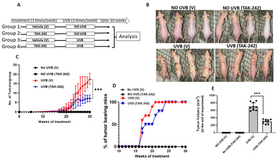 The dorsal skin of panels of SKH-1 (10 mice per group) was treated with 0.5% TAK-242 or acetone and exposed to UVB radiation (180 mJ/cm2), thrice a week up to 30 weeks.TAK-242 or vehicle was applied topically to the dorsal skin of SKH-1 mice 30 min before each exposure to UVB radiation. Mice were monitored for tumors on a weekly basis. In all experiments, mice that were not exposed to UVB were used as controls [20,24].