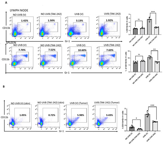 TAK-242 prevented the generation of CD11b+Gr1+ myeloid cells. SKH-1 mice were subjected to photocarcinogenesis experiment as mentioned in the Methods section. Mice were sacrificed at 30 weeks, and single cell suspensions of cells were prepared from the spleen and lymph nodes. Anti-CD11b and anti-Gr1 antibodies were used to stain the cells. The number of CD11b+Gr1+ cells, was analyzed by flow cytometry. There were significantly fewer Gr1+CD11b+ myeloid cells (** p < 0.01) in the spleens, (A) lymph nodes and (B) tumor of TAK-242 treated mice than vehicle-treated mice. The histograms depict the mean ± SD of cell number per group. Mice not exposed to UVB radiation were used as controls. Experiments were conducted in 5 mice in each group. (* p < 0.05, ** p < 0.01, *** p < 0.001 and ns, not significant).