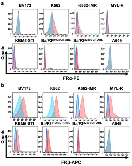 Expression of folate receptors α and β in CML cell lines. (a) Folate receptor α (FRα) expression in CML cells was measured by flow cytometry using FRα-PE antibody. (b) Folate receptor β (FRβ) expression in CML cells was measured by flow cytometry using FRβ-APC antibody. Blue: control; orange: stained sample with anti-FRα or FRβ antibody.
