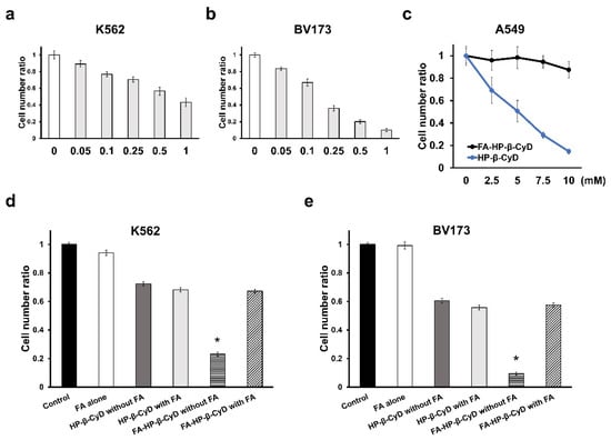 Antitumor effect of FA-HP-β-CyD. (a,b) Antitumor activity of FA-HP-β-CyD (0, 0.05, 0.1, 0.25, 0.5, and 1.0 mM) in K562 and BV173 cells. Cells were incubated with FA-HP-β-CyD for 72 h at 37 °C. (c) Antitumor activity of FA-HP-β-CyD and HP-β-CyD in A549 cells. Cells were incubated with 0, 2.5, 5, 7.5, and 10 mM of FA-HP-β-CyD or HP-β-CyD for 72 h at 37 °C. (d,e) Treatment with FA-HP-β-CyD in the presence or absence of FA. K562 and BV173 cells were incubated for 2 h at 37 °C with medium only (control), medium containing FA-HP-β-CyD (5 mM) and HP-β-CyD (5 mM) in the absence and presence of FA (2 mM). Each value represents the mean ± SEM of three experiments. * p < 0.05. The cell number ratio is the number of cells calculated with the number of cells in the control as 1.