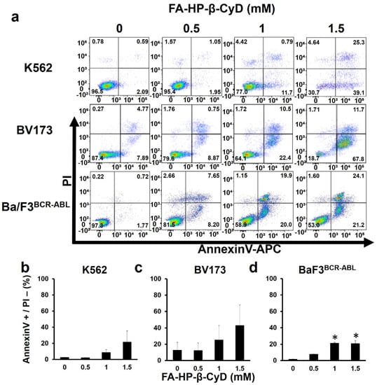FA-HP-β-CyD induces apoptosis in K562 cells, BV173 cells, and Ba/F3BCR-ABL cells. (a) K562 cells, BV173 cells, and Ba/F3BCR-ABL cells were treated with 0, 0.5, 1.0, and 1.5 mM of FA-HP-β-CyD. After 72 h of culture, the Annexin V and PI-staining was done. Representative FACS plots are shown (n = 3). (b–d) Percentages of Annexin V-positive PI-negative cells exposed to FA-HP-β-CyD for 72 h are shown. Data represent the mean ± SD of three independent experiments. * p < 0.05.
