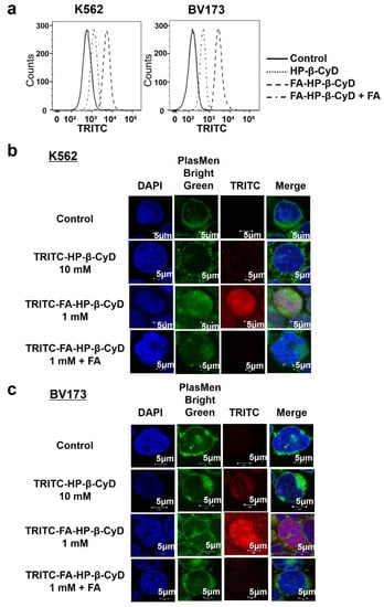 To investigate the cellular association of FA-HP-β-CyD, Tetramethylrhodamine isothiocyanate (TRITC)-labeled FA-HP-β-CyD (TRITC FA-HP-β-CyD) was used. For the preparation of TRITC FA-HP-β-CyD, 10 mg of FA-HP-β-CyD and 1 mg of TRITC were dissolved in 400 μL of DMSO. After stirring for 24 h, the solution was gradually poured into acetone. The precipitant was obtained and dissolved with water. After freeze drying, TRITC-FA-HP-β-CyD was obtained. K562 and BV173 cells (1 × 106) were incubated with 10 µM og TRITC-FA-HP-β-CyD at 37 °C for 1 h. After washing, the samples were scraped with 1 mL of PBS (pH 7.4). Data were acquired with a FACSVerse (BD Biosciences).