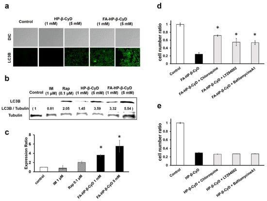 Induction of autophagy by treatment with FA-M-β-CyD. (a) Detection of autophagy in CML cells. K562 cells treated with FA-HP-β-CyD and HP-β-CyD for 2 h were exposed to Cyto-ID for 30 min. For observation, fluorescence microscopy was used. (b) Effect of HP-β-CyDs on LC3B expression in K562 cells. Cells were treated with medium only (control), FA-HP-β-CyD, HP-β-CyD, imatinib (IM), and rapamycin (Rap) for 2 h. LC3B protein levels were detected by western blotting. (c) The graph shows the fluorescence intensity of the bands. * p < 0.05 compared with the control. (d,e) Effects of chloroquine, bafilomycin A1, and LY294002 on the antitumor activity of FA-HP-β-CyD (d) and HP-β-CyD (e) in BV173 cells. Cells were incubated for 24 h. * p < 0.05 compared with FA-HP-β-CyD.