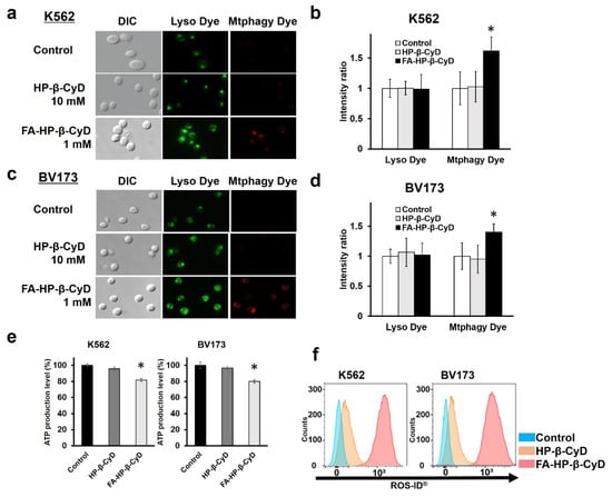 Detection of mitophagy, measurement of intracellular ATP levels, and ROS generation assay in CML cells. (a,c) Detection of mitophagy in K562 and BV173 cells. The cells were treated with Mtphagy dye, a mitophagy detection reagent, and then incubated with medium only (control), 1 mM of FA-HP-β-CyD, and 10 mM of HP-β-CyD, followed by Lyso dye, a lysosome detection reagent. Representative images are shown (n = 3). (b,d) Fluorescence intensities of Mtphagy dye and Lyso dye in the control, in HP-β-CyD-treated, and in FA-HP-β-CyD-treated cells are shown in bar graphs. * p < 0.05 compared with the control. (e) Measurement of intracellular ATP levels. K562 and BV173 cells were incubated with medium only (control), 1 mM of FA-HP-β-CyD, and 10 mM of HP-β-CyD for 2 h. Then, the cells were treated with ATP detection reagent. Bar graphs represent the mean ± SEM (n = 3 per group). * Significant difference with p < 0.05 compared with the control and FA-HP-β-CyD. (f) ROS generation assay. K562 and BV173 cells were incubated with medium only (control), 1 mM of FA-HP-β-CyD, and 10 mM of HP-β-CyD, and detected by flow cytometry using ROS detection reagents. Blue: control; orange: HP-β-CyD; and red: FA-HP-β-CyD.