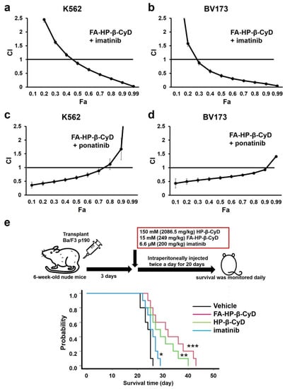 Evaluation of the combined effect of FA-HP-β-CyD and TKIs on CML cell lines, and effect of FA-HP-β-CyD on survival in a leukemia mouse model. (a–d) FA-HP-β-CyD was combined with imatinib mesylate or ponatinib. The combination index (CI) was calculated using Calcusyn and plotted as a function of the fraction affected (Fa). For example, 50% growth inhibition would result in a Fa of 0.5. We analyzed the synergistic (CI < 1), additive (CI = 1), or antagonistic (CI > 1) effects of combining multiple equal concentrations of drugs. The mean ± SD of three independent experiments is shown. (e) Survival curves of mice transplanted with Ba/F3 BCR-ABL cells positive for EGFP. Ba/F3 BCR-ABL cells (1 × 106) were injected into nude mice. Three days after injection, 200 μL of the vehicle, 150 mM (2086.5 mg/kg) of HP-β-CyD, and 15 mM (249 mg/kg) of FA-HP-β-CyD were intraperitoneally administered twice a day. Imatinib mesylate was dissolved in deionized distilled water and 6.6 μM (200 mg/kg) of imatinib was given by oral gavage twice a day. The administration was continued for 20 days and survival was checked daily. Black lines, green lines, red lines, and blue lines indicate the survival curves of mice treated with the vehicle, with 150 mM of HP-β-CyD, 15 mM of FA-HP-β-CyD, and 6.6 μM of imatinib, respectively. Survival data were analyzed using a log-rank non-parametric test and are shown as Kaplan–Meier survival curves (n = 10). * p < 0.05, ** p < 0.01, and *** p < 0.001.