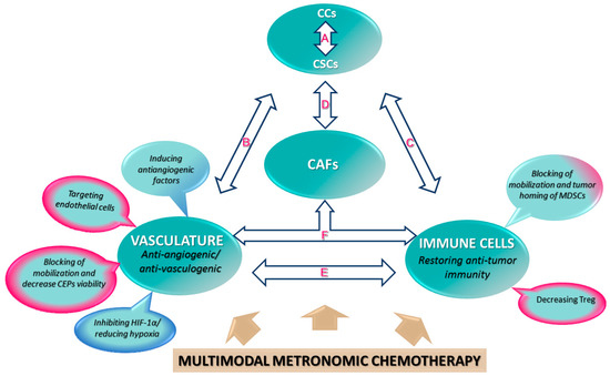 General biological mechanisms of action of MC to explain their antitumor effects. Links that create a permissive tumor microenvironment and could be affected by metronomic chemotherapy (two-way arrows). The CSC population is characterized by heterogeneity, plasticity, and therapy-resistance [215,216]. The reciprocal interactions between CSCs, cancer cells, endothelial cells, immune cells, CAFs, and other extracellular elements of the tumor microenvironment regulate CSCs in the primary tumor and metastases [217,218]. (A–D): (A) A feedback-signaling mechanism occurs between cancer cells (CCs) and CSCs. CSCs can induce the conversion of non-stem cells into metastatic-CSCs with a migratory phenotype [219]. Hypoxia/HIF-1α promotes epithelial-to-mesenchymal transition in cancer cells and maintains stemness [220]. (B) CSCs are drivers of vascularization, and the perivascular area constitutes a supportive niche. (C) CSCs maintain populations of immunosuppressive cells (e.g., MDSCs, Treg), and tumor-associated MDSCs, in turn, are key components of CSC niches and are essential for the formation of the pre-metastatic niche. (D) CSCs induce the transformation of normal stromal fibroblasts into CAFs, which maintains the proliferation and self-renewal of CSCs. Bidirectional link between vasculature and immune cells: (E) Tumor-recruited MDSCs are pro-angiogenic and can be transdifferentiated into endothelial-like cells. Tumor MDSCs are immunosuppressive by inhibiting tumor T-lymphocytes and NK cell activation and by inducing immunosuppressive Treg which, in turn, can promote tumor angiogenesis. Cross-talk between CAFs and the vasculature and immune system: (F) CAFs contribute to tumor angiogenesis and promote tumor CEP mobilization and recruitment. In turn, tumor endothelial cells can undergo an endothelial-to-mesenchymal transition to CAFs. In addition, CAFs mediate tumor immunosuppression by promoting MDSC recruitment and attracting T-lymphocytes and their differentiation into immunosuppressive Treg. This figure is based on previous studies [20,28]. See Section 3 for more detailed information. Reprinted with permission from the original with modifications Ref. [29], Copyright 2021, Elsevier.