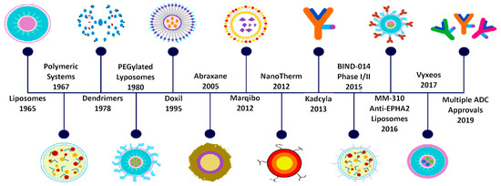 Schematic representation of the evolution of NCs towards targeted nano carriers (TNCs) in clinical cancer treatments. Some NCs formulations approved or in clinical trials, based in lipid (Doxil, Marqibo, MM-310; Vyxeos), inorganic (AMAG, NanoTherm), natural molecules (ABI-009, Abraxane), and polymers (BIND-014; AZD2811), as well as engineering monoclonal antibody for target treatment (SGT-53, Kadcyla: Traszumab conjugate with emtansine). Reprinted with permission from Ref. [275].