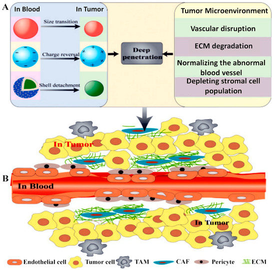 (A) Representation summarizing current strategies to improve the tumor penetration of NCs in response of tumor microenvironment. (B) Scheme of tumor vasculature and microenvironment. Reprinted with permission from Ref. [272], Copyright 2021, Elsevier.