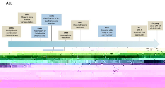 Relapsed or refractory ALL or CLL patients after two or more lines of treatment may need alternative therapies to treat their disease. New therapies, especially immunotherapies, are emerging to treat these and other hematological cancers. Chimeric antigen receptor (CAR) based therapy is positioning itself as one of the most promising therapies for getting rid of the malignant cells. ALL and CLL biological and clinical milestones are summarized in Figure 1.