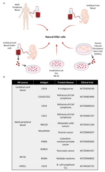 (a) Diagram of the different cell sources used to obtain NK cells. These NK cells can be directly collected from Adult Peripheral Blood and Umbilical Cord Blood. They can be differentiated in vitro from CD34+ hematopoietic stem cells taken from umbilical cord blood, and also from hiPSCs, which are differentiated towards CD34+ cells and then to NK cells. There is an established NK cell line called NK-92. (b) Most relevant CAR-NK clinical trials use different sources of NK cells and different antigens, depending on the type of cancer.