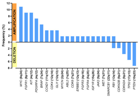 Regarding CNVs, the most frequently found amplifications contained MYC, KIT, and PDFGRA. Deletions affecting PTEN were the second most frequent CNVs. Deletions of CDKN2A and CDKN2B were also frequent.