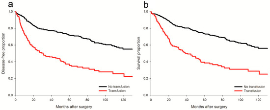 Disease-free and overall survival plots for the transfused and non-transfused patients. (a) disease-free survival; (b) overall survival. Both p < 0.001 by log rank test.